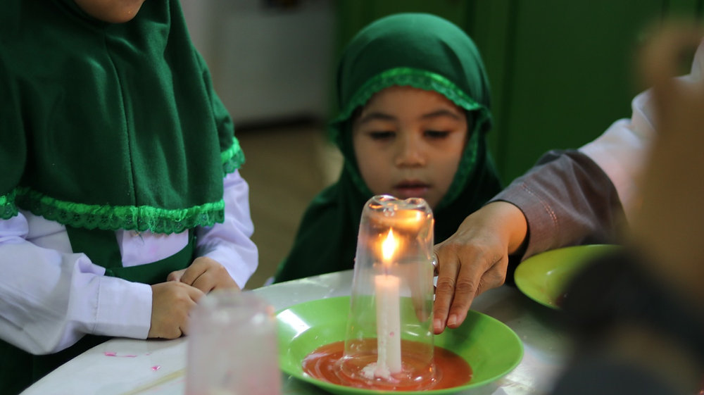 Kegiatan eksperimen sains ini dirancang dengan pendekatan learning by doing, di mana murid dapat melihat, menyentuh, dan merasakan langsung proses sains dalam bentuk yang sederhana. Guru memandu setiap langkah eksperimen dengan bahasa yang mudah dipahami. Ketika gelas ditutup di atas lilin menyala, anak-anak memperhatikan perubahan yang terjadi api perlahan padam, dan air di piring naik ke dalam gelas. Dengan penuh antusias, para murid pun berdiskusi: “Kenapa apinya mati, Bu?” atau “Kenapa airnya naik?”. Pertanyaan-pertanyaan polos itu adalah bukti bahwa rasa ingin tahu ilmiah sudah mulai tumbuh dalam diri mereka.