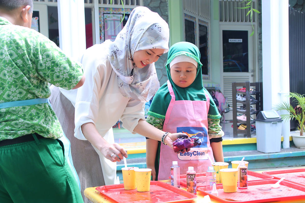 Anak-anak belajar bahwa tidak ada hasil yang datang dengan cepat atau mudah, dan untuk mendapatkan sesuatu yang indah, mereka harus melalui proses yang membutuhkan ketelitian dan ketekunan. Kegiatan ini juga memberikan mereka kesempatan untuk mengembangkan keterampilan mengatur waktu dan kesabaran, serta menghargai usaha yang dilakukan untuk mencapai hasil yang diinginkan. Proses menunggu pewarnaan.